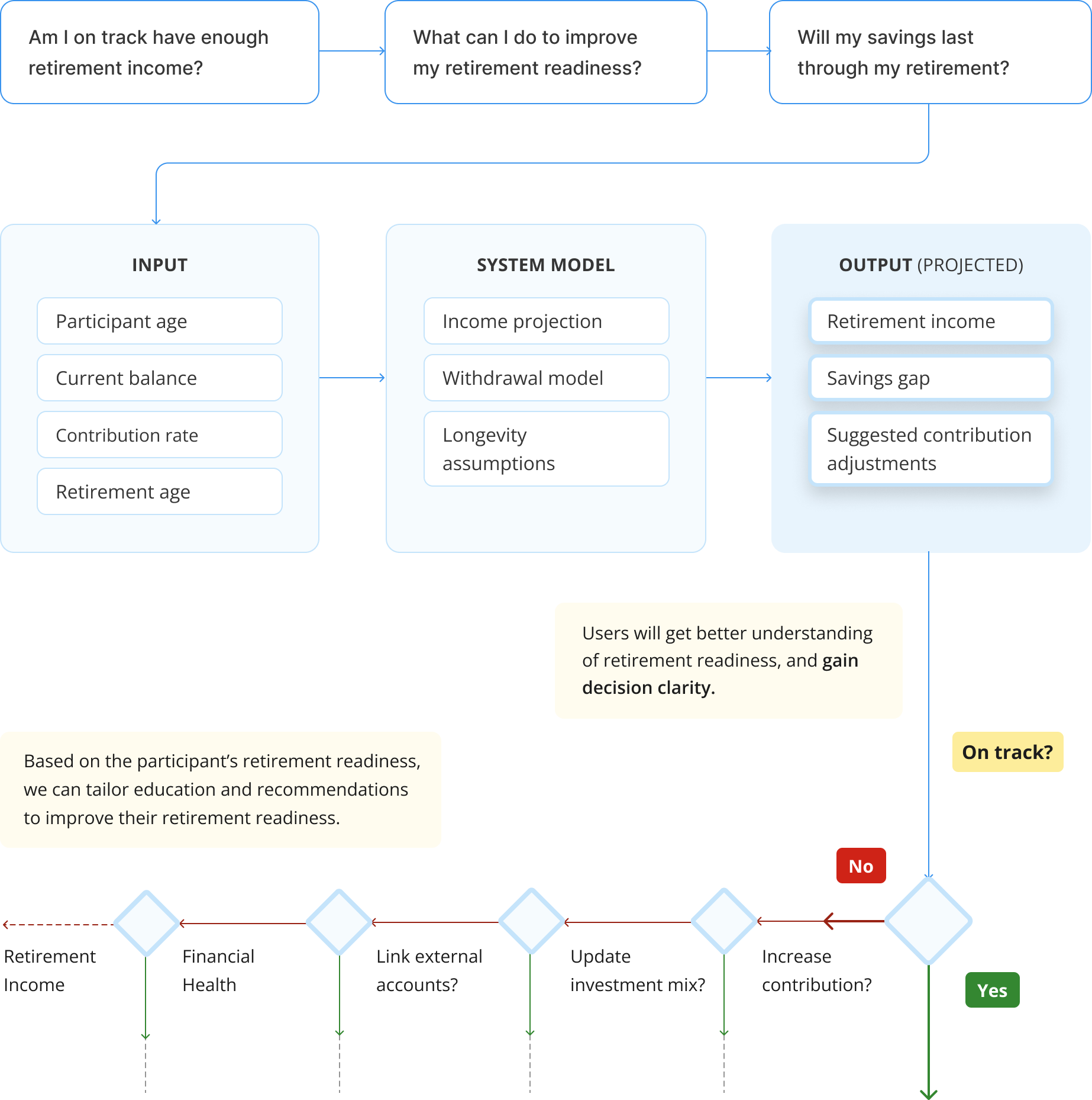 At T. Rowe Price, internal data told a similar story — users logged in regularly to check their balance, but most had no clear picture of whether they were on track or what steps could meaningfully improve their retirement readiness. The gap wasn't just financial. It was informational. The question became: how could the 401(k) experience move beyond a balance statement and help people retire with confidence and sufficient income?