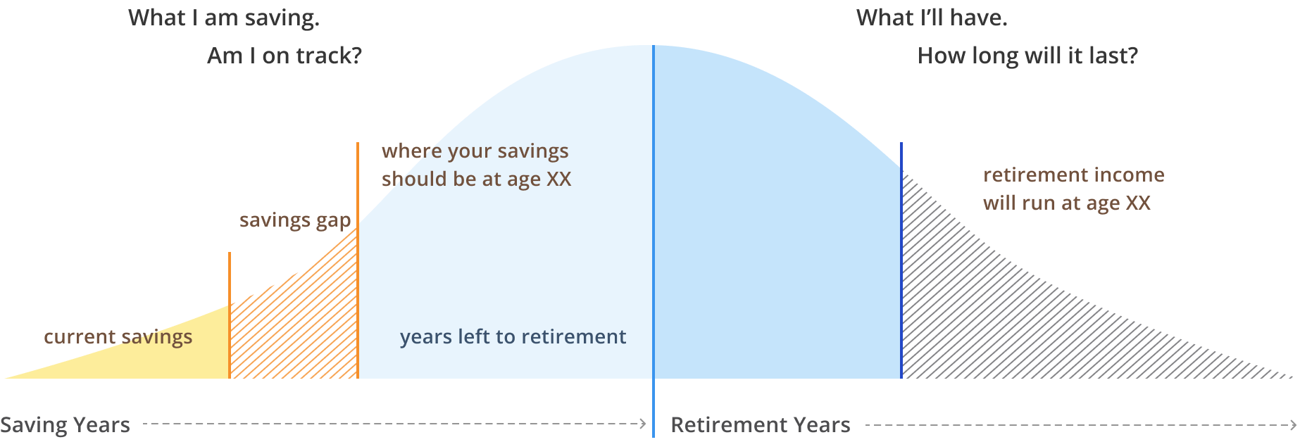 But research revealed something deeper: most users didn't just lack visibility into their gap — they had no frame of reference for what it meant for their future. Seeing a shortfall in dollars wasn't enough. What moved them was understanding the consequence — that without change, their savings would run out. This shifted the design direction from "here is your gap" to "here is your future" — expanding the visualization to trace both accumulation and decumulation, so users could see not just the gap, but exactly when and how their money would run out.