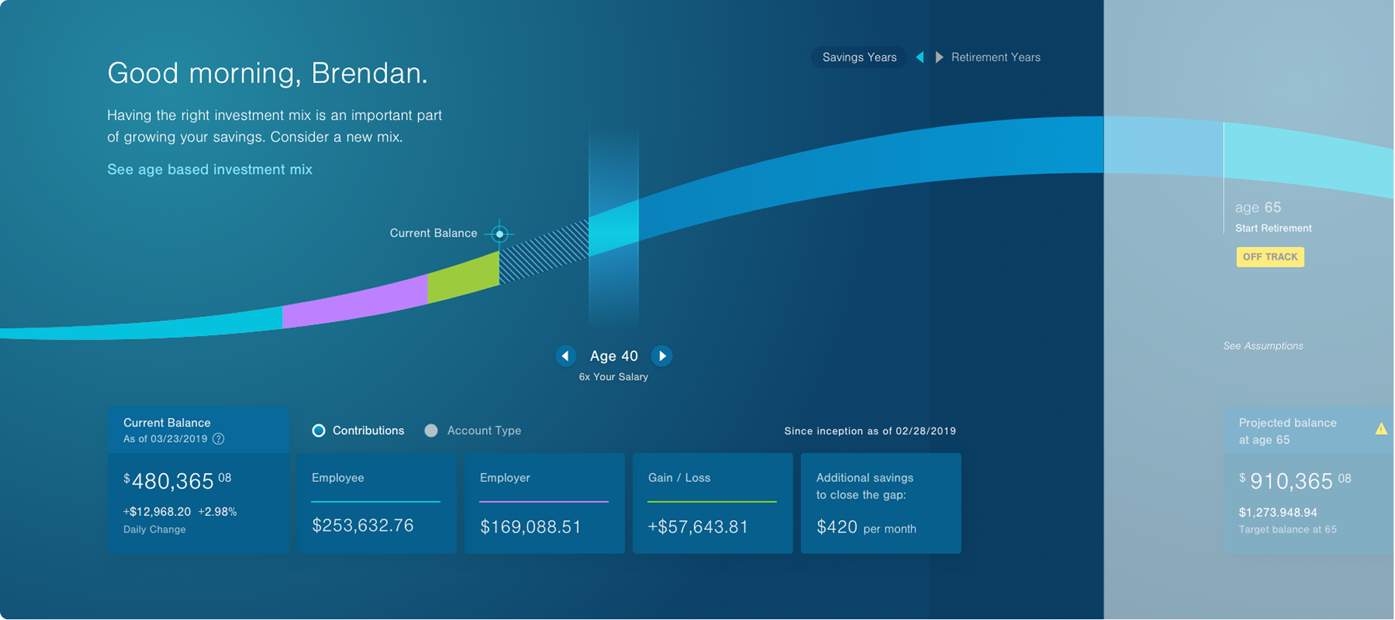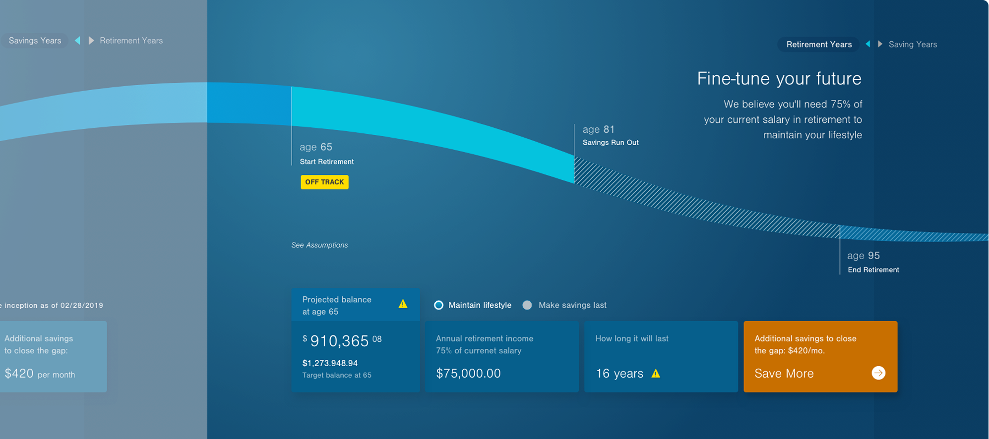 The design challenge was to help users quickly understand the relationship between age, current balance, and contribution rate — and whether they were on track to produce sufficient retirement income — while understanding the consequences of their current strategy and surfacing actions to improve it.